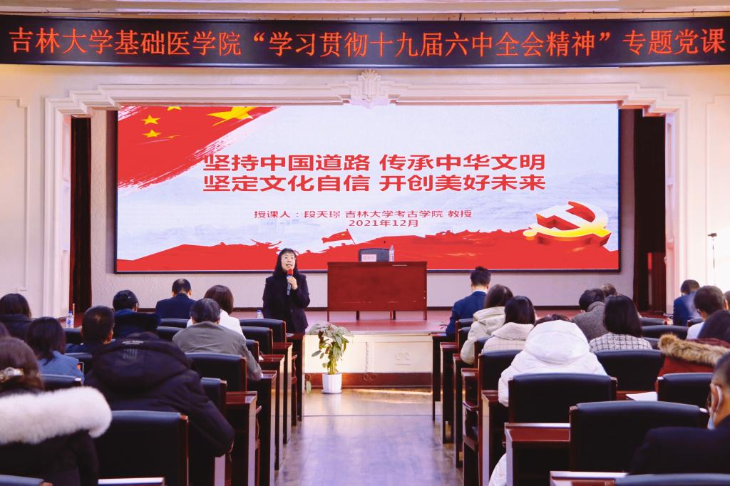 为深入学习贯彻党的十九届六中全会精神,引导广大师生深入学习领会全会精神的丰富内涵与核心要义,2021年12月15日,学院党委邀请金沙2004路线js5学习贯彻十九届六中全会精神宣讲团专家、金沙2004路线js5考古学院副院长、博士生导师段天璟教授为学院做了一场题为“坚持中国道路,传承中华文明,坚定文化自信,开创美好未来”的专题党课。报告会由学院党委书记王晓荣主持,学院领导班子成员、中层干部及师生党员共计一百余人参加了本次党课学习。