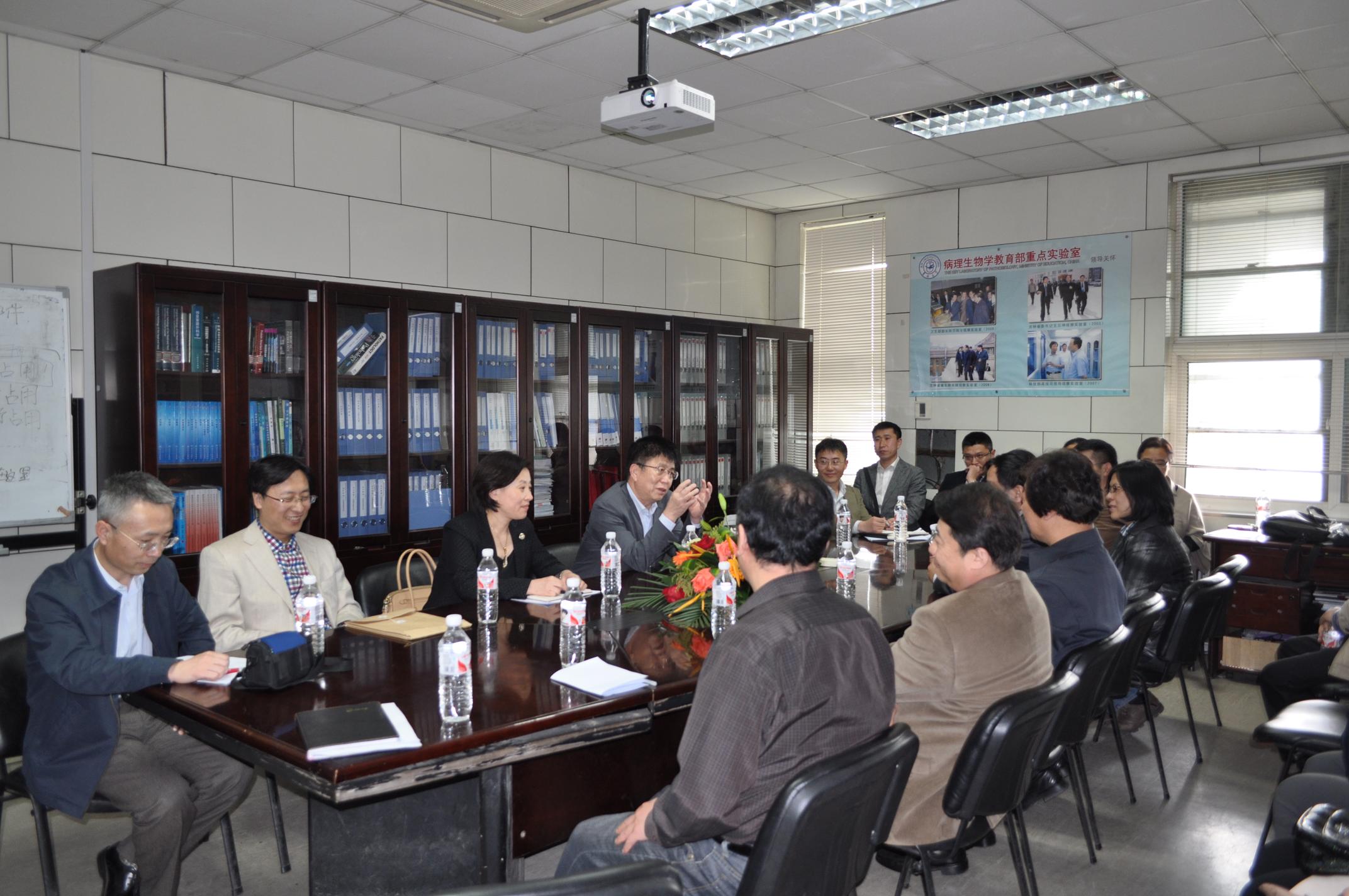 首先,白求恩医学院科研副院长陈立从科研基地、人员构成、近三年的科研情况等方面对学院的学科平台建设进行了简单介绍,提出长期存在的空间不足和硬件设施急需更新的问题,建议打破学科界限,建立医学部共享平台。李玉林从教学平台和科研平台建设等方面总结了病理生物学教育部重点实验室的现状,建议建立开放性医学共享平台、加大引进人才及人才培养力度等。孙连坤指出学院将以本次调研为契机,展示基础医学的优势,吸引各学院与基础医学合作,并提出合作模式应该多样化,共同促进医学发展。随后,病理生理学、病原生物学、免疫学、药理学学科带头人分别汇报了本学科平台建设情况。最后,王冠军对基础医学克服底子薄、设备旧等困难取得的成绩进行了充分肯定,同时表示医学部将搭建医学大平台,促进基础医学与临床医学及其他学科的交流合作。
