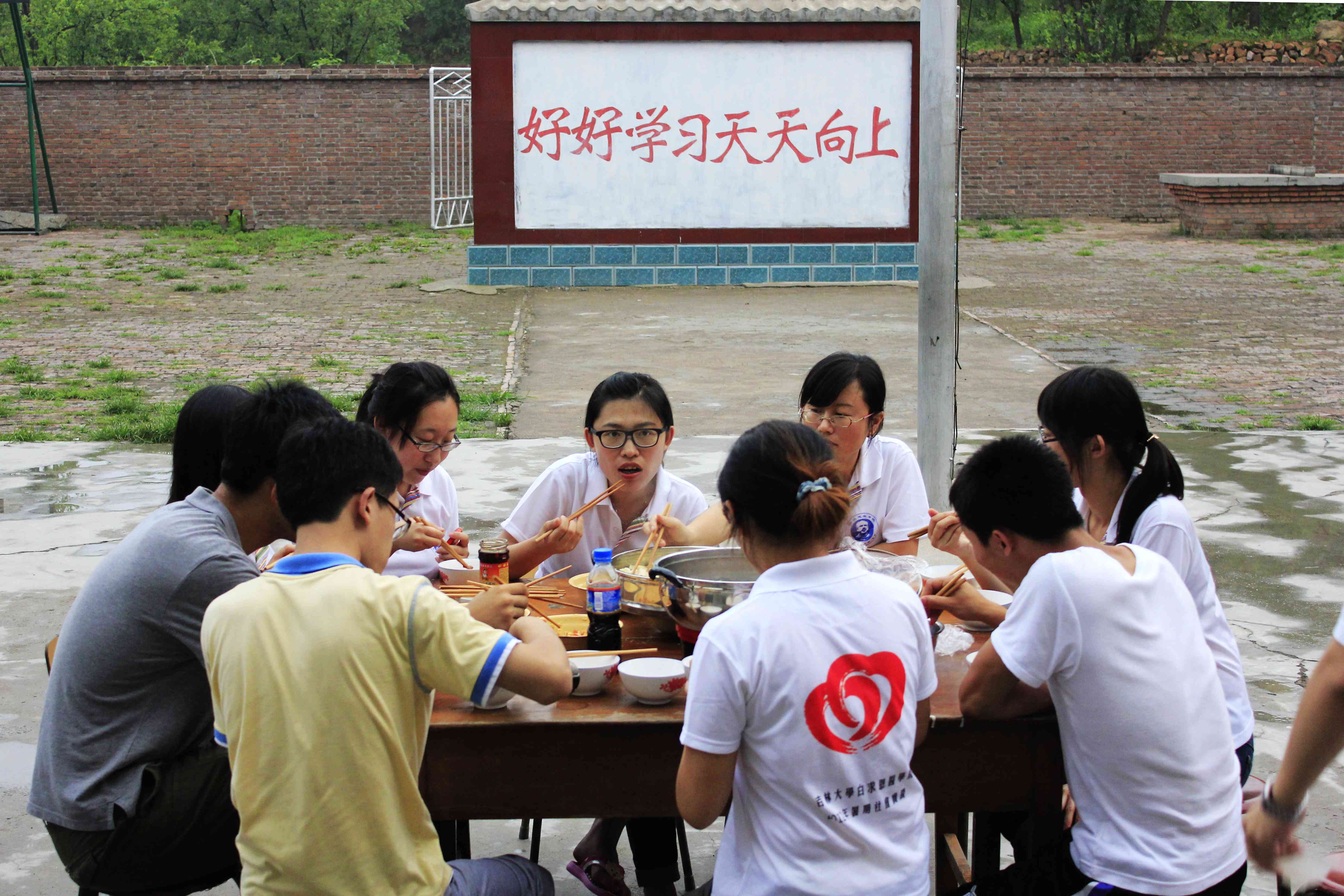 离开了白求恩墓,小分队就直接奔赴牛眼沟村白求恩希望小学。学校校园虽小,但很整洁。校长早早地在白色的教学楼前迎接我们。因为条件有限,所有的队员都在地上打地铺,每日的三餐也要队员们自己动手准备。天气很热,蚊虫很多,但队员们仍坚持着克服种种困难,迎接接下来的几天社会实践。