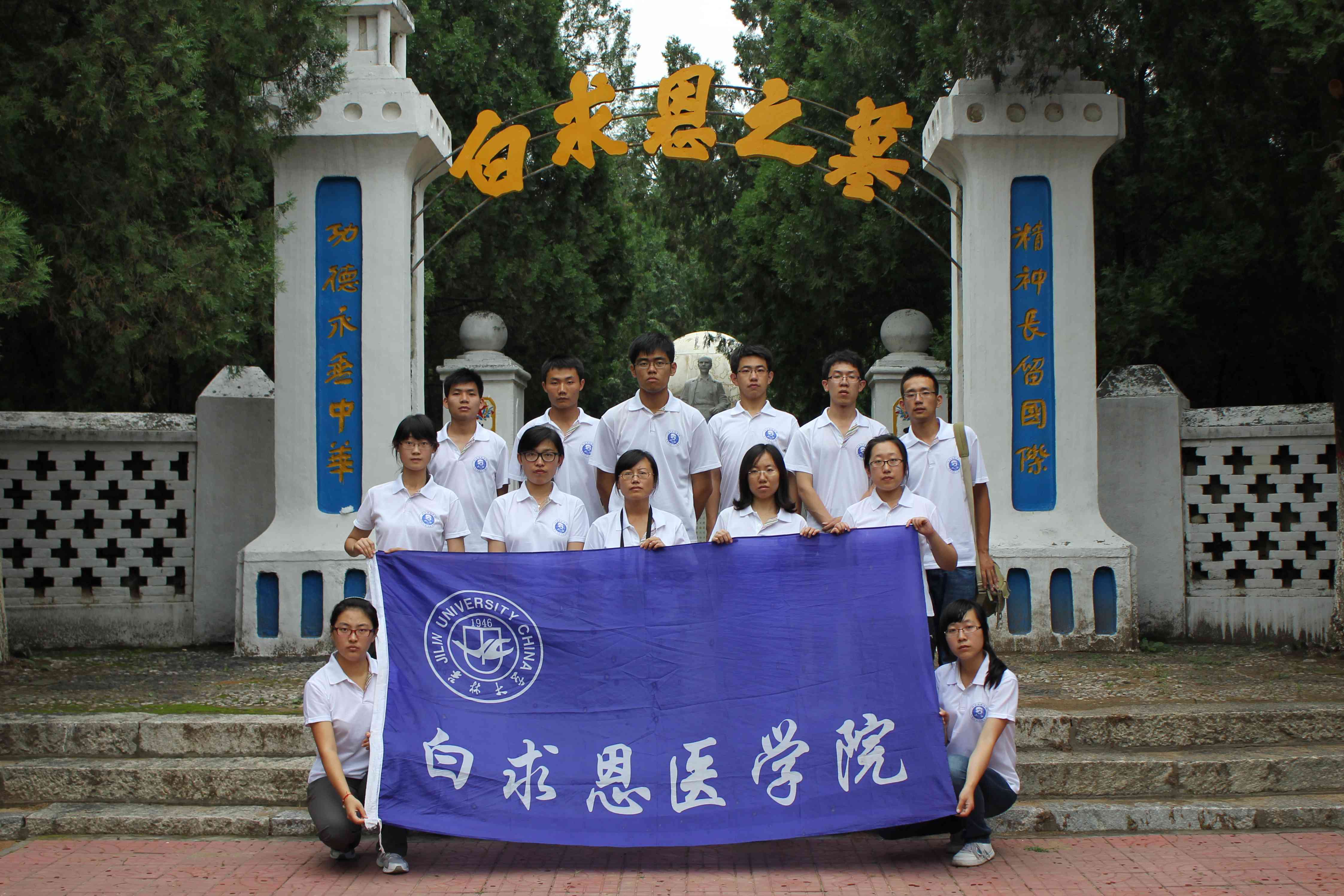 下午,社会实践小分队满怀崇敬之情来到了晋察冀烈士陵园,进行白求恩墓祭扫仪式。这里非常幽静,苔痕阶绿,青松围绕,踏上青石台阶,看到白求恩肃穆的雕像,是那样亲切。首先,大家向白求恩墓默哀一分钟,其次,朱鹤代表志愿者讲话,她表达了学习白求恩精神及坚持做一名医务工作者的决心。随后,在实践小分队队长赵狄的带领下,所有队员庄严宣誓,“健康所系,性命相托”的铮铮誓言回荡在每个人的心中。然后,带队教师魏宇航进行总结,她鼓励大家以白求恩精神作为自己的准则,努力奋斗,争取早日成为一名合格的医生。最后,大家向白求恩墓敬献白花。整个仪式正式而又庄严,队员们都心潮澎湃,更坚定了自己学医的信念与梦想。
