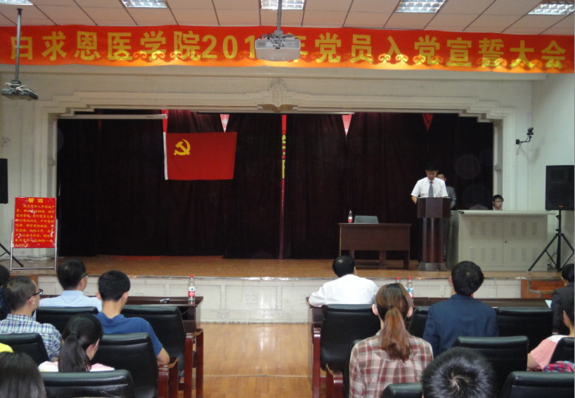 6月15日晚,白求恩医学院2012年党员入党宣誓大会在金沙2004路线js5新民校区基础楼二楼多功能学术报告厅举行。白求恩医学院党委书记屈英和、党委副书记费淑波、部分老师和全体党员、预备党员参加了本次大会,大会由学院党委副书记兼副院长苑锐主持。