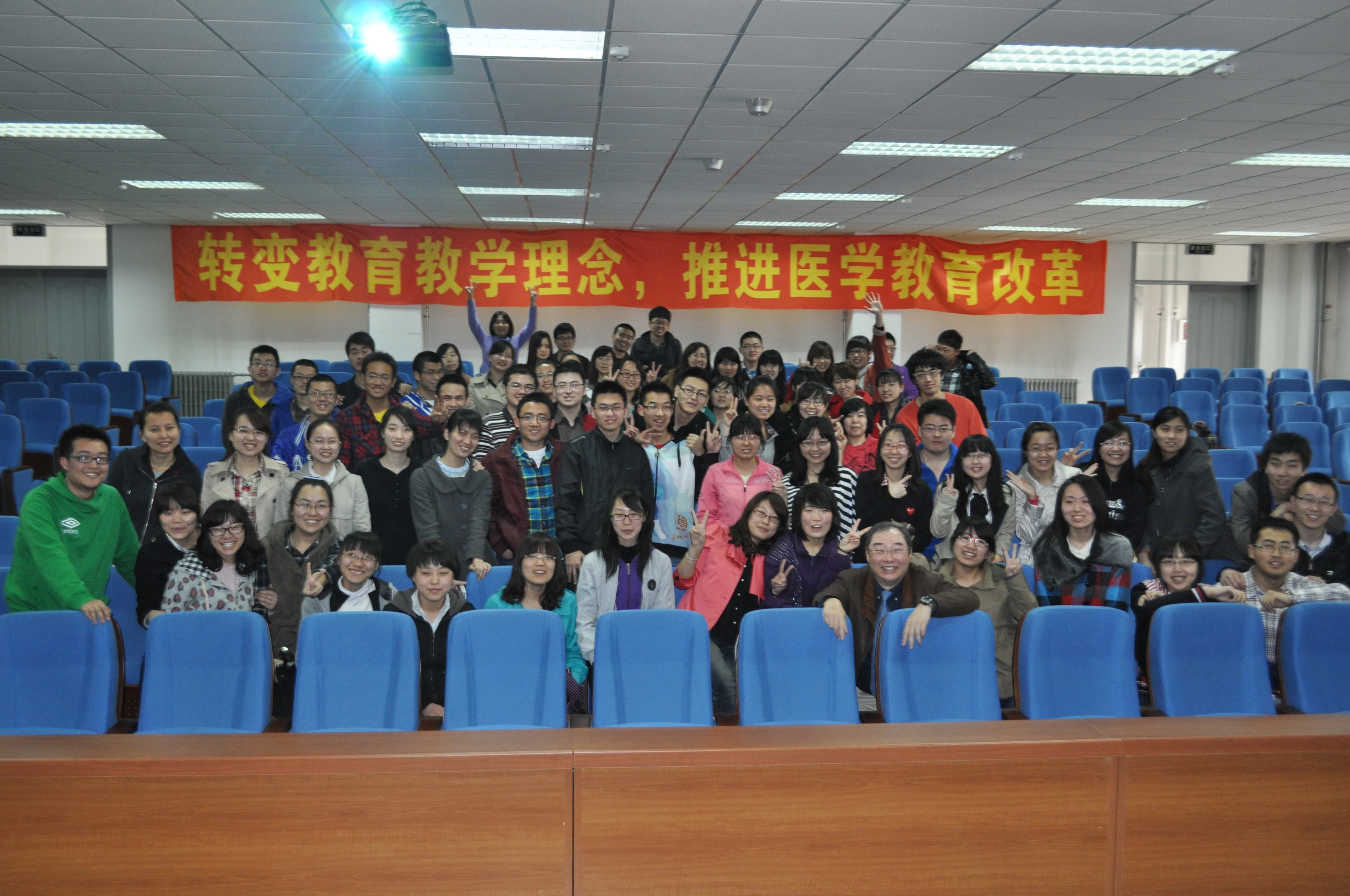 首先,陈维熊用诙谐的语言和生动的事例向同学们阐述什么是良医、如何成为一名被社会认可的良医。随后,分享了阳明大学医学院海外志愿服务历程,用自己的亲身经历告诉同学们行医之路的艰辛与快乐;展示了学生们医疗志愿服务后的心得感受,通过切身体会,使学生深刻理解一名医生的价值所在。陈维熊还向大家详细讲解了阳明大学培育多元发展医学生的课程架构和实用、多样的学科设置及教学评量方式。与会学生积极踊跃的提出问题,陈维熊耐心、幽默的解答赢得现场阵阵掌声。报告会后,现场气氛依然活跃,学生意犹未尽,依依不舍的围住陈维熊继续请教。