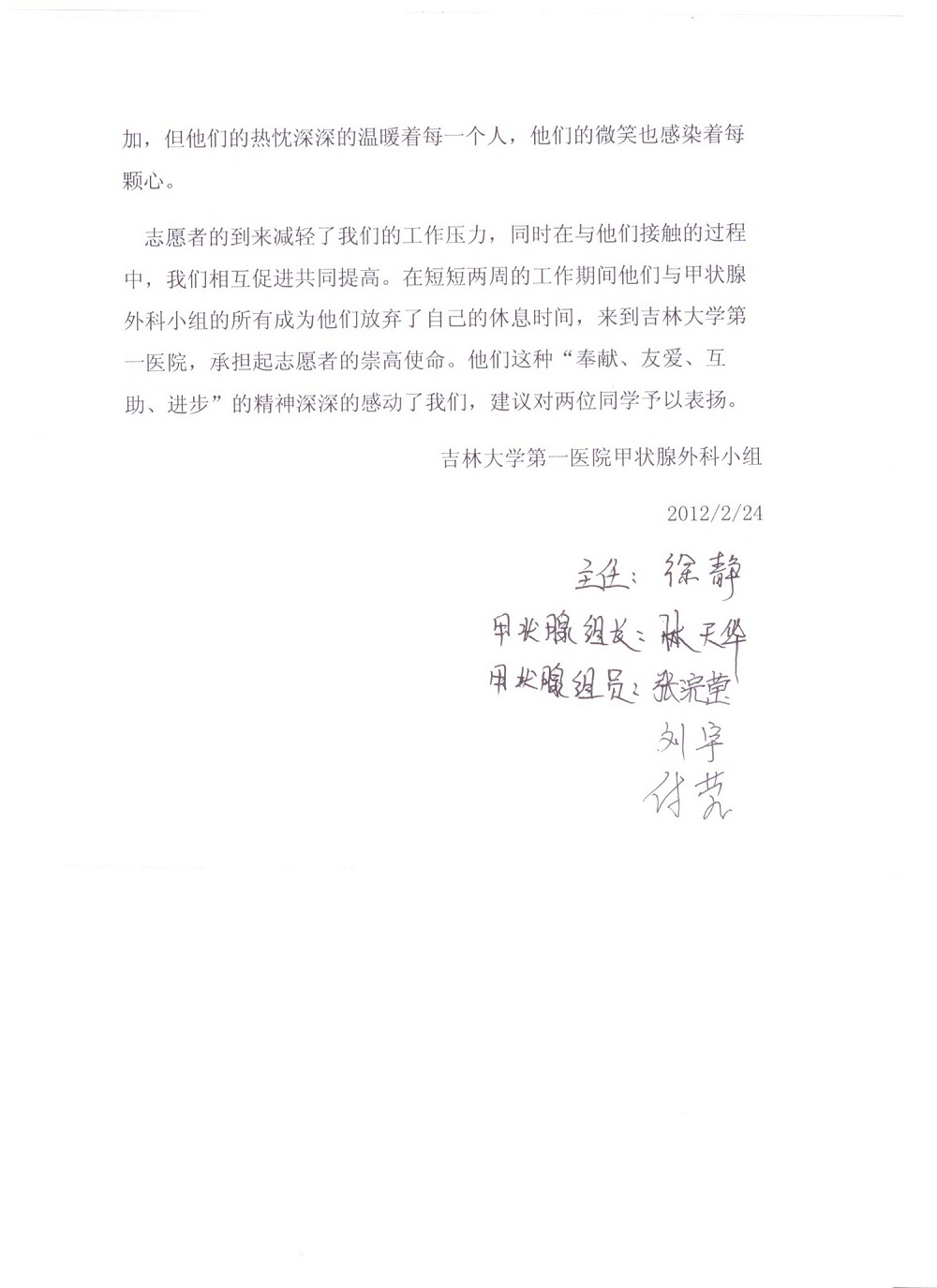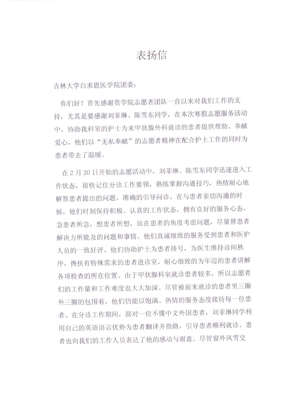 近日,白求恩医学院团委收到金沙2004路线js5第一医院甲状腺外科小组寄来的表扬信。对我院志愿者团队为金沙2004路线js5第一医院所做的志愿服务工作表示感谢,尤其是感谢701101班的刘菲琳同学和701002班的陈雪东同学,他们在寒假志愿者服务活动中协助科室护士为来甲状腺外科就诊的患者提供帮助、奉献爱心,以“无私奉献”的志愿者精神为患者带去了温暖。